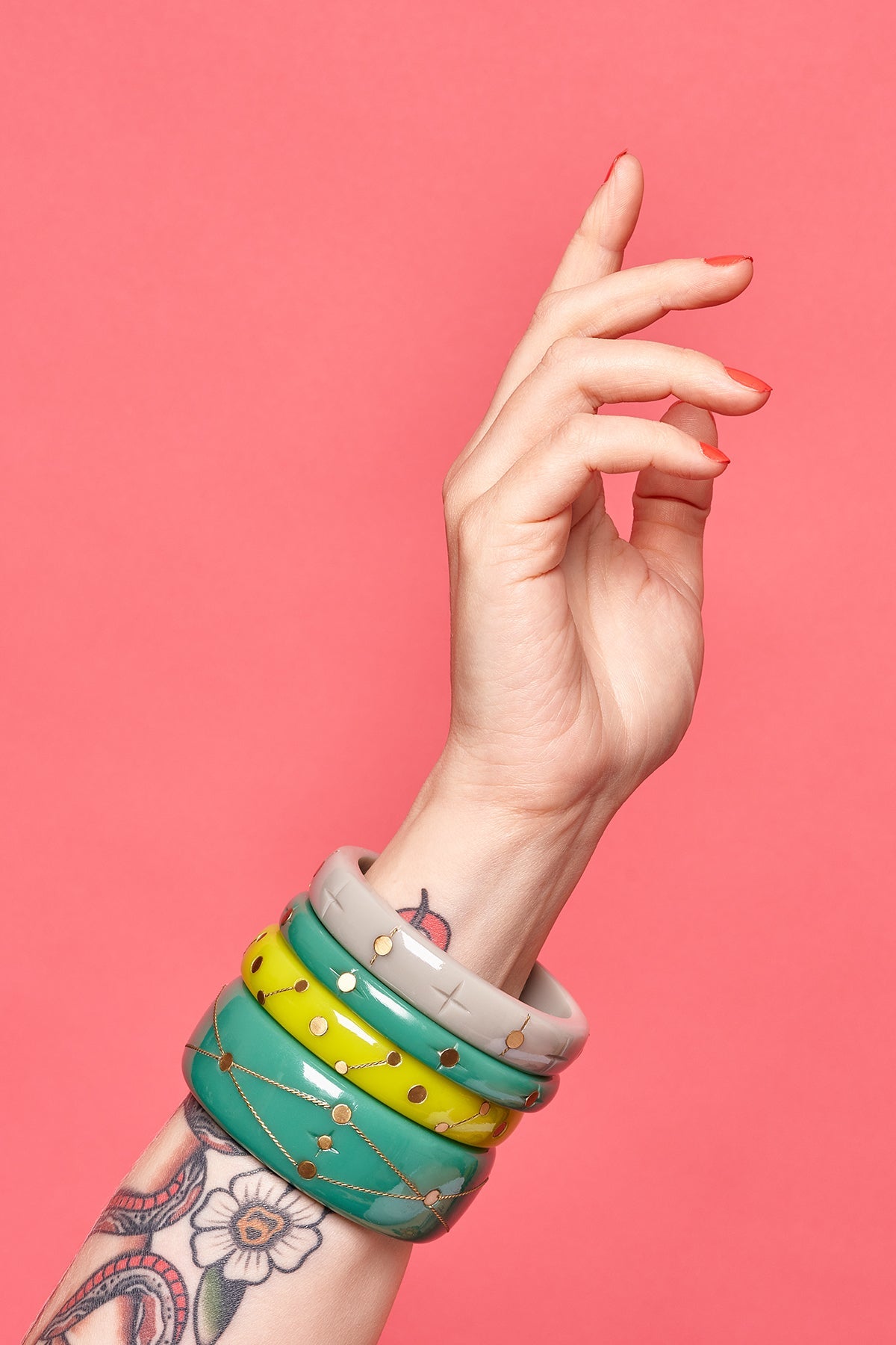 Rock a retro look with our Acidic Necklace set! Made with a non-tarnish finish, this quirky set includes matching earrings and bangles. No more worrying about tarnishing - just effortless style. (No more green necks or wrists, yay!)