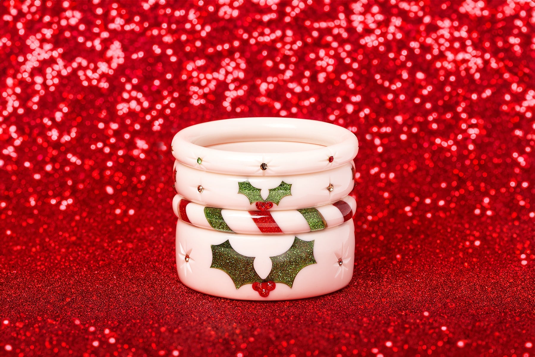 A beautiful vintage inspired white resin bangle with a delicate glitter holly design. Its subtle Christmas charm adds festive cheer to any look. Highly durable and long-lasting, our Midi Holly Bangle will last through many festive seasons.