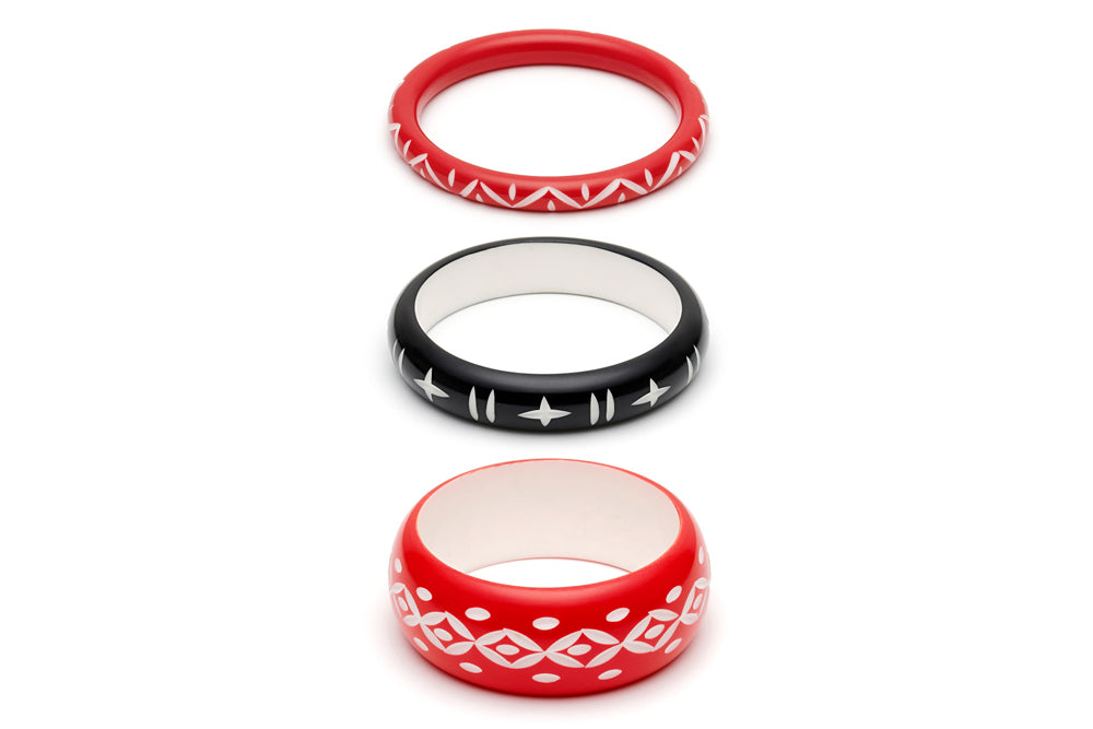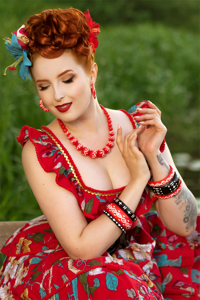 Love is all around with this delicious Duotone combo of ravishing red and white carvings. The contrast is so eye catching and will complete any and all vintage inspired outfit, whether you're going for a classic 1940s look or a rockabilly loving 1950s style.