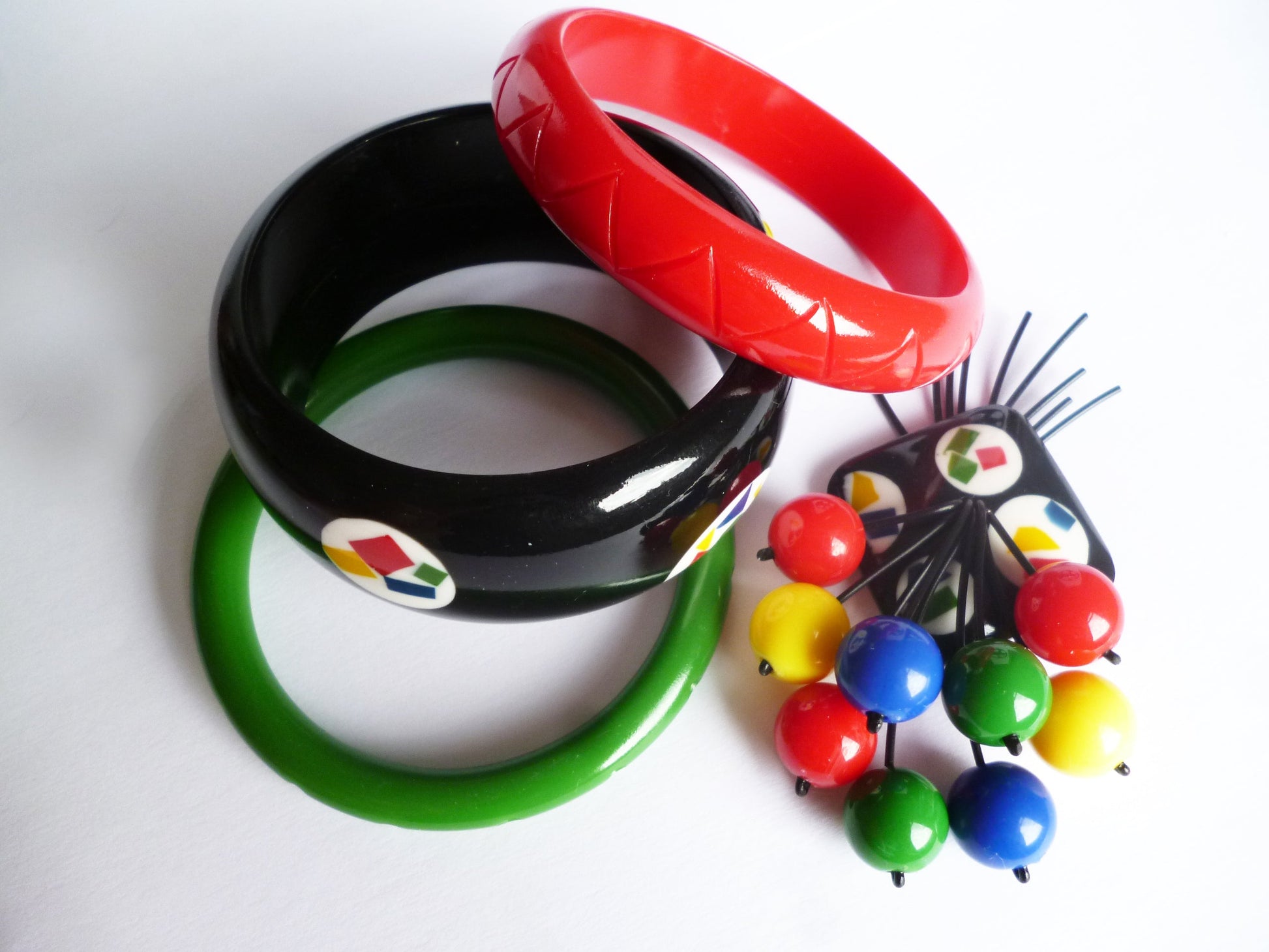 The inspiration for this set came from original 1940s dot and confetti Bakelite bangles in lovely, bright primary colours.