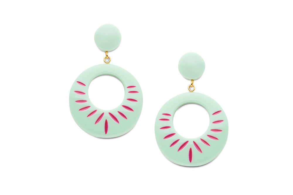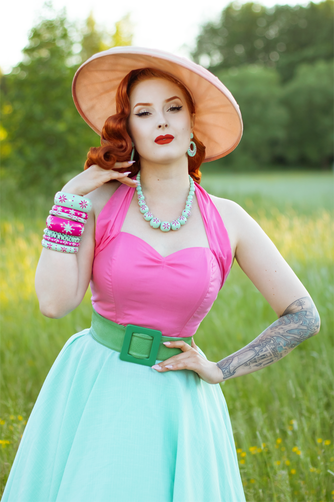 The perfect Duotone partnership of cool mint green fakelite with bright pink carving makes Parrot a great 1950s style summer combo. Ideal for all you who love a tropical getaway vibe to go with your vintage inspired outfit.
