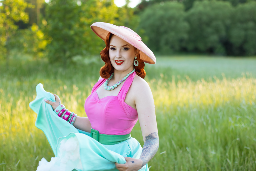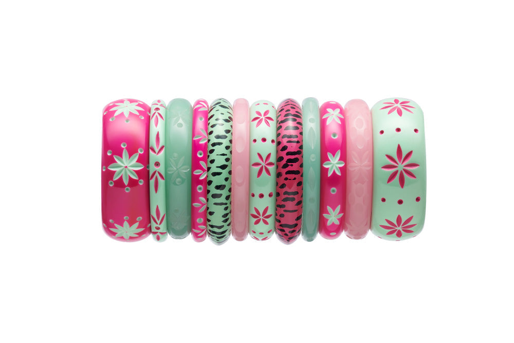 The perfect Duotone partnership of cool mint green fakelite with bright pink carving makes Parrot a great 1950s style summer combo. Ideal for all you who love a tropical getaway vibe to go with your vintage inspired outfit.